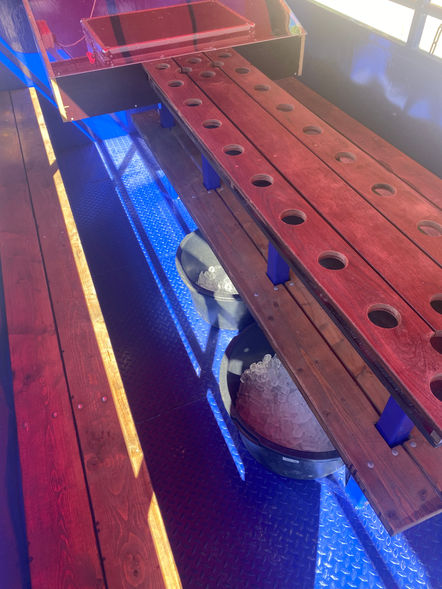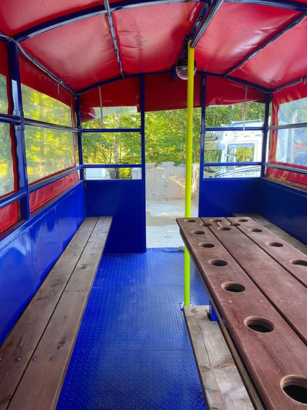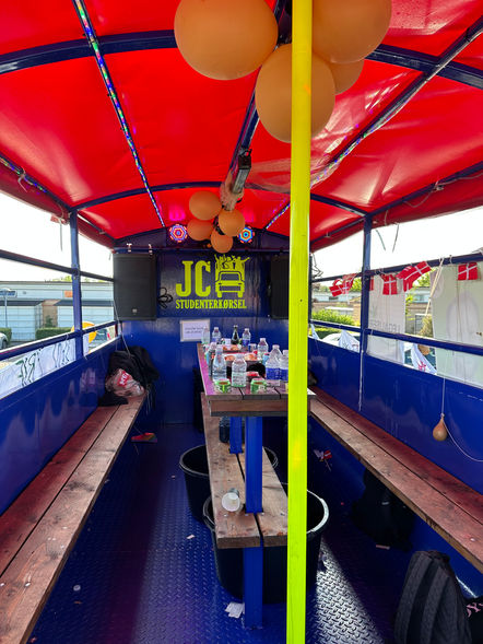 Her står vi klar med chauffør, vogn, forsikring og udstyr med bl.a. lyd, diskolys, polestang, is i baljer til kolde drikkevare og beerpong-bord som fast inventar.